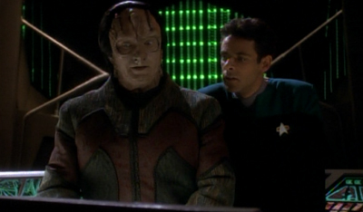 That said, there is at least some sense to putting the story at the start of the third season rather than in the first or second. The reminder of how alien the station is works better if we’ve been lulled into a false sense of complacency. “You know,” Bashir notes, “I’ve been here nearly three years and I was just finally starting to think of this place as home.” Kira points out, “Your home was built by Cardassians, Doctor. Don’t ever forget that.”