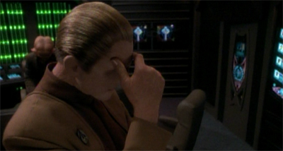 Again, this is something that make a lot more sense in hindsight. With the lights turned down, the self-destruct ticking down and his passcodes no longer valid, one can imagine Garak’s claustrophobia kicking in. It’s a character trait that would not be confirmed until the show’s fifth season, but his quick temper and frustration here fits remarkably well with that aspect of Garak. After all, the other members of the senior staff are dealing with a similar amount of pressure, but keeping their heads. It’s a nice example of how something the show articulated later on actually enhances a viewing of an earlier episode.
