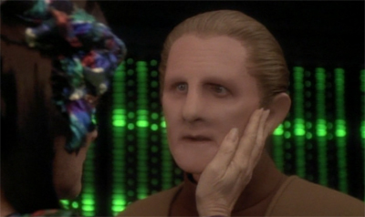 And then there’s Lwaxana Troi. Lwaxana is a troubled character, in that she’s treated as a walking punchline far too often, as if the idea of a sexually aggressive older woman is inherently hilarious. To be fair, Deep Space Nine uses her a bit better than The Next Generation did, and there’s always a sense of “Lwaxana as a person” underneath “Lwaxana as a joke.” The jokes about her pursuit of Odo (and his evasion of here) get a little tired, but there is just a hint of genuine emotion buried underneath it all.