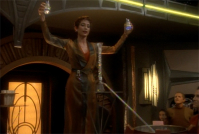 In a way, it fits the “get visually interesting performers to do visually interesting things” brief a lot better than Equilibrium did, and Fascination demonstrates that the show has a solid enough cast that it can rest somewhat comfortably on them. These seem like people who have lives outside of their assigned roles on the station. Even the poker game on The Next Generation seemed weirdly official, consisting of “the senior staff… and O’Brien.” Here, the crew hang out with each others’ partners and friends and family.