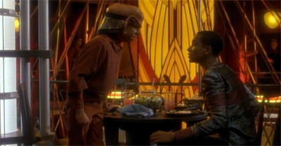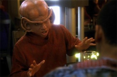 More than that, though, the episode really struggles with these scenes. The date scene is treated as if the audience should find it hilarious – “ha! look at those wacky Ferengi!” However, it doesn’t work that way. Nog’s conduct here – belittling his companion and demanding she serve his needs in a humiliating way – feels like a scene from an abusive relationship. This not helped by the fact that Riska is incredibly passive and has four short lines. She politely tells Nog to get lost, but she then gets up and just stands there waiting for Leanne to say her piece.