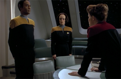 While Star Trek isn’t really built to support episodes with heavier long-term conclusions, it still feels like a cop-out. When Sisko came down softly on O’Brien’s mutinous conduct at the end of Captive Pursuit, it was made clear that this was a passive endorsement of O’Brien’s conduct. At least Sisko’s criticism of Worf in Change of Heart gave the impression of having consequences. Picard never really had to deal with a moment like this in Star Trek: The Next Generation, but even his brutal criticism of Wesley in The First Duty has more bite than this.