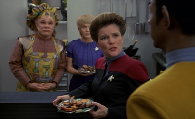 I found this an interesting episode for a number of reasons. For one, we have a nice alien of the week that was willing to invite Voyager in as guests and provide supplies without it being some kind of trap. If this were TNG or DS9, the aliens would be trying to drain the fluids from their bodies, or kidnap the crew. It was almost unsettling that there was no evil plan all along (which Chakotay was genre savvy enough to suspect one). I’m not even sure it’s right to say there is even an antagonist in this episode.