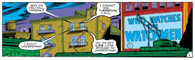 This fascination with darkness and violence reflects the worst of the influence that Watchmen and The Dark Knight Returns had on mainstream superhero comics. It’s not for nothing that Vandal Savage makes this observation in a panel with an advertisement referencing Watchmen. The advertisement asks, “Who Watches the Watchmen?” Perhaps the more relevant question might be, “Who Understands the Watchmen?”