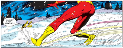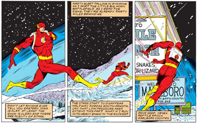 The first two issues of the new Flash comic work hard to establish limits and boundaries on Wally West’s abilities as the Flash. When he explains that it will take him three hours to deliver a heart transplant, the doctors are astonished. “Three?” one asks. “We thought you could travel at light speed.” Wally replies, rather simply, “No more. I have a top speed of 705mph. It isn’t easy to sustain.” It feels like a rather conscious and forced attempt to impose an arbitrary limit on what the Flash could do.