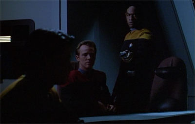 6. Rewatching this one, I did find the framing of the big “Janeway, Paris and Kim figure out that the alien presence is Chakotay” scene to be unintentionally hilarious in the way that poor old Brian Markinson is just kind of stuck on the periphery of the frame with no lines whatsoever.