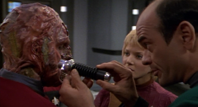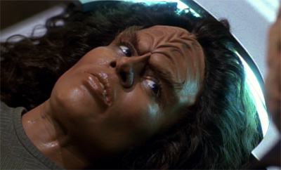 That said, it is a little weird that Faces is built around a Klingon immunity to the Phage, the disease ravaging the Vidiian people. “For generations my people have been searching the quadrant for a species immune to our disease in the hope that it would lead us to a cure,” Sulan explains. “I believe your genetic structure has phage-resistant nucleotide sequences, yes. But I needed a pure specimen to be certain. My people do not know it yet, but you are their greatest hope.”