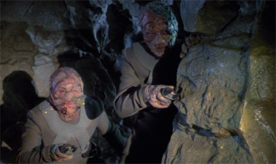 That said, they work very well in the context of Faces. The decision to reimagine the Vidiians as Nazis works very well in the context of the episode’s retro vibe. Far from independent organ thieves, it turns out that Vidiian society does exist in some form; that they are more than just wandering and disorganised scavengers. Whereas the Vidiians in Phage appeared to be individuals operating for their own well-being, the mining operation here appears to be a government-run installation.