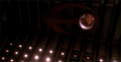 This is perhaps most obvious in the Bashir subplot. Echevarria’s script is – like his script for Improbable Cause – very self-aware, pausing to acknowledge and play with franchise conventions and behind-the-scenes concerns. At one point, Jake wonders about the bathroom facilities on their Bajoran space ship. It seems to mirror the oft-repeated gag about how nobody ever needs to use the bathroom on Star Trek. “How am I suppose to…?” Jake wonders. “How are you supposed to…?” All Sisko offers is a knowing, “You’ll get the hang of it.”