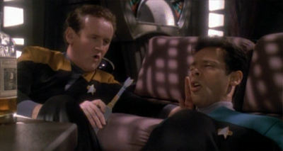 (There’s also a nice acknowledgement that Bashir is more self-aware than he may seem in his punchable moments. “I hated you when we first met,” O’Brien confesses. Drunkenly, Bashir concedes, “I remember.” Bashir certainly never acknowledged this in early episodes like The Storyteller or Armageddon Game, completely ignoring O’Brien’s stand-off-ishness. This seems to support the idea suggested in If Wishes Were Horses… that Bashir is acutely aware of how he comes across, and so over-compensates.)