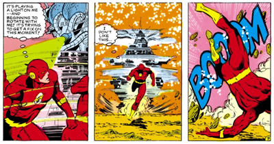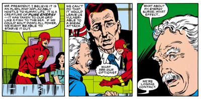The nature of the Kilg%re itself also changes dramatically as the plot demands it. It is originally an electronic life form. Wally describes it as “a creature of pure energy — it has taken to our grid like a fish to the sea.” This is a fascinating idea, and one that feels right at home in The Flash. After all, the comic is perfectly suited to all sorts of wacky pseudo-science. Indeed, an enemy composed of pure energy feels like a pretty great enemy for “the fastest man alive.”