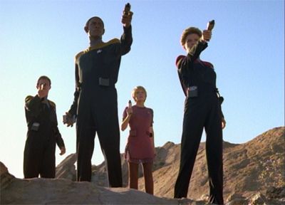 The episode also moves relatively quickly, benefiting from a reasonably tight script. Although it certainly doesn’t compare to the action sequences from The Way of the Warrior, there are some nice space action sequences on display. The production design is pretty great; the location work at the Vasquez Rocks (from Arena, among others) feels like a throwback to good old pulpy Star Trek. It’s nice to get a glimpse of Chakotay as an action hero, especially since “rebel hero Chakotay” is generally downplayed so the show can focus on “stereotypically Native American Chakotay.”
