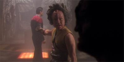 As with a lot of nineties pop culture dealing with issues like gangs, there’s a sense of sensationalism in Initiations. The nineties saw an explosion in urban mythology surrounding the street gangs – including various brutal initiations and cruel schemes. Watching the episode – as with most of the other Kazon episodes – it’s hard to imagine what Kazon society must look like. Based on what we see, all the Kazon do is wander from star system to star system trying to murder one another. There’s no wider context for their actions, no exploration of what their culture is actually about.