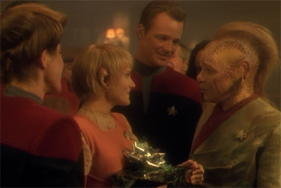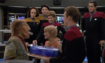 While this makes a certain amount of sense – Kes is an alien, to be fair – the fact that Kes is only two years old also means that it has the weird effect of infantilising her. The crew aren’t just explaining birthdays to an alien, they are explaining them to a two-year-old alien. (Asked what she liked most about the party, she innocently responds, “I suppose what I liked best was that all my friends were there.”) In an episode about her relationship with Neelix and about how Paris probably wants to sleep with her, this is quite unsettling. Then again, the relationship between Neelix and Kes was always creepy, without reminding viewers she is two years old.