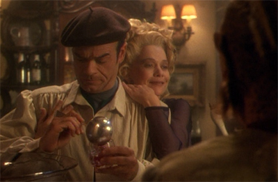 This isn’t the only subplot with an awkwardly sexist element to it. The Doctor transfers his program to the holodeck to help celebrate Kes’ birthday. While he is there, he finds himself resisting the “predatory advances” of a middle-aged hologram. It appears that the sexual politics of Star Trek have not evolved far from episodes like Manhunt, which work on the basis that a sexually aggressive middle-aged woman trying to court a disinterested man must be inherently hilarious. Ugh.