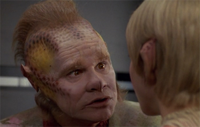 Still, it’s hard to sympathise with Neelix when he spends a significant portion of the episode making crass insinuations about Kes’ relationships with the other men on the ship. “How do you know where everyone’s quarters are?” he asks. When she assures him that she “just” remembers, Neelix is less than convinced. “Remember from what? Have you been in all their quarters?” When she mentions another man by name, he practically jumps down her throat.