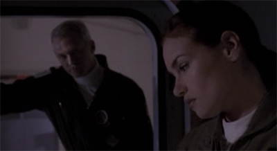 The Dark Side of the Sun is an episode focusing on the character of Shane Vansen, played by Kristen Cloke. Vansen is a compelling character, and Cloke does good work here, despite the script’s occasional clunkiness. Indeed, looking at Cloke’s performance, it could be argued that Vansen was Space: Above and Beyond‘s biggest influence on Battlestar Galactica – she seems like a clear influence on Starbuck from the relaunched science-fiction show.