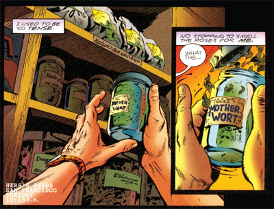 There is a sense that Petrucha is having a bit of fun here, with that wonderful double-bluff structured into the story and lots of little touches. The first two panels of the comic foreshadow the final reveals, with one victim murdered while stacking “Mother Wort.” Similarly, the San Francisco setting and the decision to base the case around a shop named “Herb’s Herbs” helps create a sense that this is perhaps a less serious or straightforward case. Tiptoe Through the Tulpa is a light little story, but the script knows how light it is.