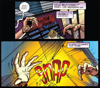 Indeed, Petrucha’s core themes can be seen playing out in the background of the story – notions about reality and perception, and how the two concepts intersect. Quoting from the Isha Upanishad, the perpetrator’s mother makes reference to the distinction between “the self” and the mortal organic body that holds it. This touches on ideas that Petrucha has woven into his run since it began.