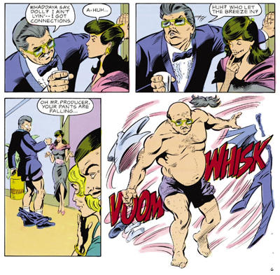 Velocity 9 even contains a reference to superhero pornography, with Bassaglia the mobster conspiring to have his lover seduce Wally West so that he can film it, kinky mobster that he is. “I should think a blue movie featuring the Flash would do very well in the foreign market,” he boasts. This is around the same time that John Byrne decided to cast a mind-controlled Superman in a porn film with Big Barda during his run on Action Comics. This interest in pornography staring iconic superheroes is something that actually happened.