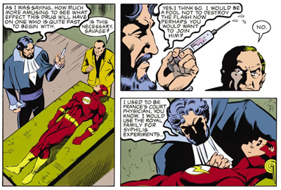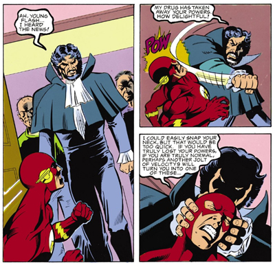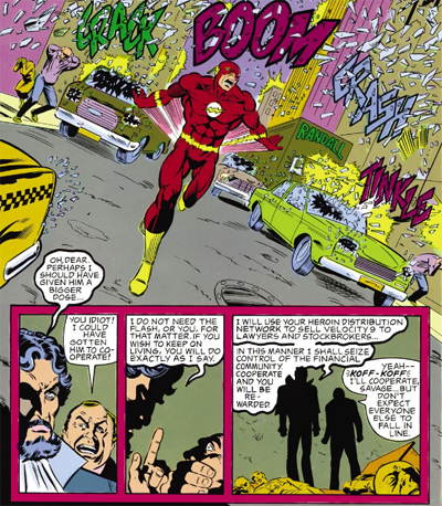 Velocity 9 seems to suggest – with a surreal earnestness – that drug dealing is the worst possible form of evil. Confronting Vandal Savage, Wally West remarks, “Savage! I knew you were a maggot, but I never thought you’d stoop to pushing drugs.” Really? Vandal Savage is a genocidal immortal who has schemed to conquer (or even destroy) the world. It seems surreal to think that he would draw the line at drug-dealing.