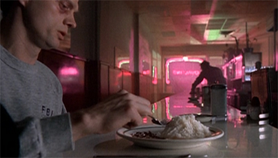 The show even draws attention to the way that it is edited. Scene transitions occur without the use of a cut to firmly delineate one sequence from another; characters stop engaging with one scene and start engaging with another. There is a wry sense of humour to all this. One of the hour’s (many) brilliant gags has Mulder asking a local diner owner if he ever experienced “a period of missing time”, sandwiched between two quick cuts that represent missing team for the audience; and maybe the characters.