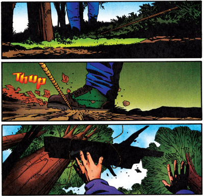 In Falling, Petrucha and Adlard wear their influences on their sleeves. Just in case the audience doesn’t recognise Falling as an entry in the long list of stories about how kids can be monsters, Mulder is seen reading Lord of the Flies in his hospital bed at the end of the comic. However, Falling is particularly interesting for its clever juxtaposition of Lord of the Flies with more traditionally American narratives about children.