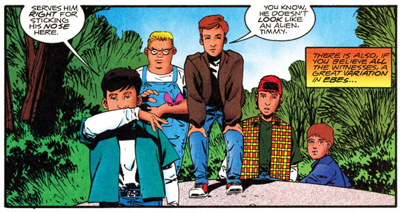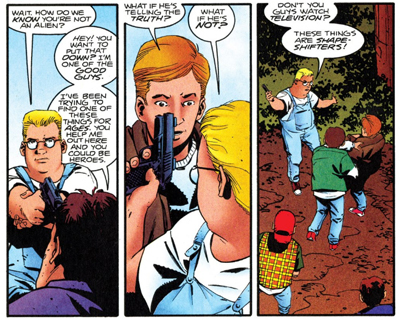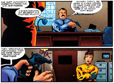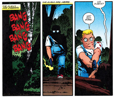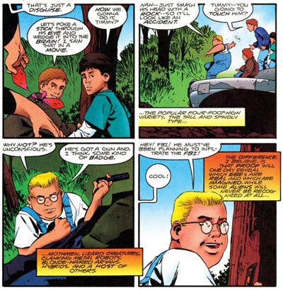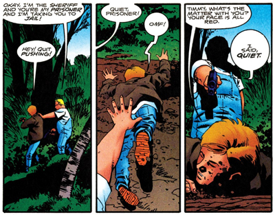 “Well, you know how kids are, Scully,” Mulder suggests in the closing pages of the comic. “They never listen to adults. But they always manage to imitate us.” The dialogue is set over a picture of well-armed American soldiers helping to take away the wreckage of the crashed alien space ship. It is no coincidence that Timmy’s first murder occurs while he is role-playing as sheriff, with the story treating the reveal of his father’s identity as a major plot twist.