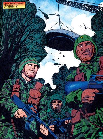Petrucha and Adlard had broached this before. This was the key point in Big Foot, Warm Heart, where the eponymous creature shows more humanity than the human antagonist of the story. One Player Only featured a delightful red herring when it suggested a murderous artificial intelligence had driven a developer to a killing spree at a software company, only to reveal that the developer’s actions were entirely his own. It will be taken to the logical extreme in Home of the Brave, essentially the duo’s grand finalé.