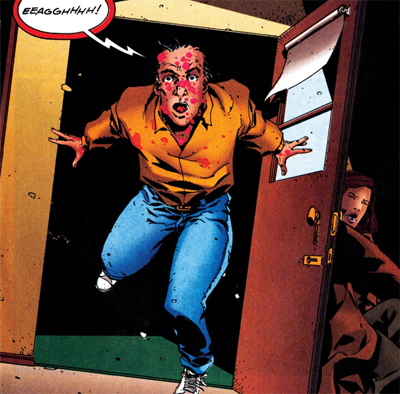Here, Petrucha does something quite similar to what he did with One Player Only, setting up something that looks like a stock moral panic plot. In One Player Only, a developer working at a company making violent video games goes crazy – one might forgive the assumption that his constant exposure to violence played a part. In Falling, Petrucha introduces us to pint-sized psychopath, reflecting contemporary fears about new breed of remorseless killing machines. In both cases, Petrucha swerves sharply.