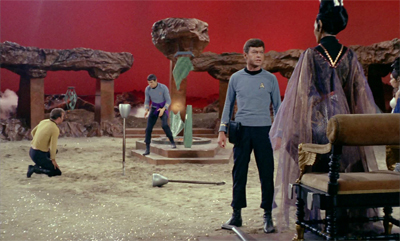 Amok Time is interesting because it presents the viewer with the first real glimpse into the world of the enigmatic Mister Spock. Literally, in the sense that this is our first trip to Vulcan. However, it also affords us the first real look at Mister Spock’s quarters. We had briefly glimpsed a small section of them in The Menagerie, but this is the first time that the audience has been invited to spend any significant amount of time in them. With beautiful sculptures that evoke Earth’s eastern cultures, shades of red and incense burning, these quarters hint at a more spiritual side to the show’s half-Vulcan character.