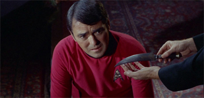 The most significant female character who isn’t brutally murdered over the course of the episode is the stenographer at the trial/inquiry – and even she is held hostage and threatened with a knife. Wolf in the Fold doesn’t help matters by building this sexism into the plot logic itself. Asked to account for why the entity targets women, Spock suggests, “I suspect preys on women because women are more easily and more deeply terrified, generating more sheer horror than the male of the species.”