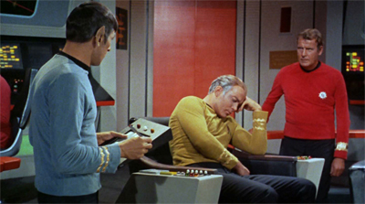 The episode makes much of how the human (or alien) body inevitably fails us. “You’ll have to speak louder,” Robert states in the teaser as Kirk asks him pressing questions. Although less affected than his colleagues by virtue of Vulcan longevity, Spock seems more sensitive to the cold than usual. McCoy becomes even more folksy. Kirk becomes quite cranky and adversarial. “Anyhow, it doesn’t matter,” he mumbles during his hearing. “There’s a lot more to running a starship than answering a lot of fool questions. A lot more. Go ahead. Ask me questions.”