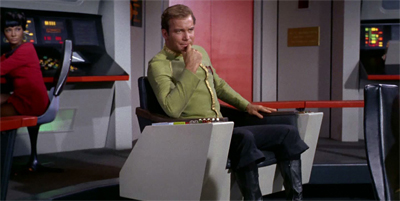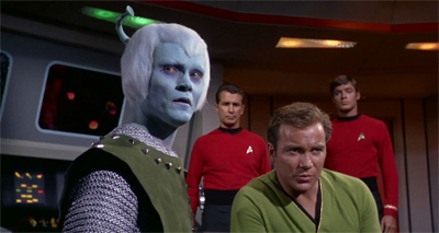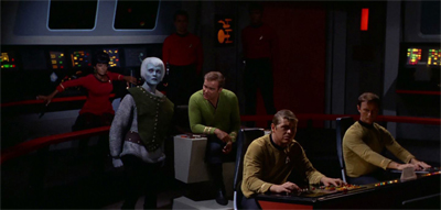 But even though it’s a Spock-centric episode, Kirk still has a chance to shine. Getting out of bed with a knife wound and pretending he’s fine so that Spock’s doing his duty DOESN’T cost him both his father’s life and his mother’s love, that’s a wonderful testament to Kirk’s character. And then his ability to fake out the Orion captain while on the verge of passing out from a knife wound — that’s our Kirk, all right.