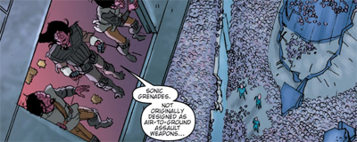 Alien Spotlight: Tribbles has a pretty dark sense of humour. It is quite heavily implied that the issue unfolds on a planet where the Tribbles have wiped out the humanoid population. Crashing on the planet surface, the human freighter crew are alarmed to discover that the formerly thriving indigenous population is nowhere to be found. “So the planet went through a climate change?” one of the crew asks. Another speculates, “And the people all emigrated…” The third replies, “Guess so.”