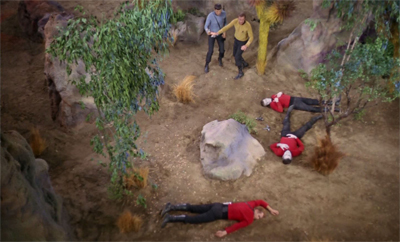 Director Ralph Senensky points to another example of the red shirt problem in the same episode, where actor Jerry Ayres turns up despite dying in the earlier episode Arena. As Senensky notes: