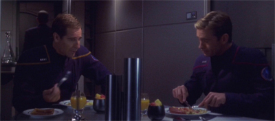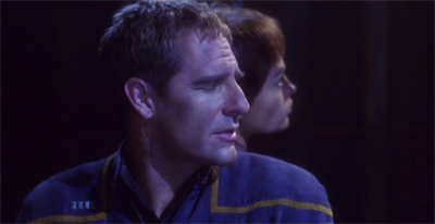 Enterprise would never quite get a handle on these sorts of stakes, but it would do better. While it isn’t necessarily that much more convincing, at least the “Trip may be leaving” subplot from the fourth season has the character actually leaving the ship. It might have been more effective to keep Connor Trineer off-screen for a few episodes, but it is much more effective than what happens in Shadows of P’Jem, where T’Pol is going to leave and then she isn’t.