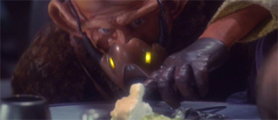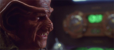 Deep Space Nine veteran Jeffrey Combs is brought in as a recurring guest star. Rogue Planet is a direct lift from Captive Pursuit. This is a Ferengi comedy episode. Oasis is a direct plot lift from Shadowplay. While Acquisition buried Voyager regular Ethan Phillips under a mountain of Ferengi make-up, Oasis featured Deep Space Nine regular Rene Auberjonois prominently without any make-up. Even the relationship between Krem and Ulis here recalls the relationship between Rom and Quark. (“My cousin knows what’s best for me,” Krem explains. “He manages all my financial transactions.” He adds, “I don’t have the lobes for business.”)