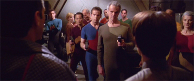 More than that, Oasis luxuriates in Auberjonois’ presence. Of course, he’s a great actor, so it makes sense to focus on him – but the camera lingers on him very heavily. His character is very much in the background of the first encounter between the Starfleet crew and the Kantare, as Kuulan takes charge and gets the lion’s share of the dialogue. However, the camera keeps cutting back to him – to the point where the first act closes with a shot where Auberjonois is conspicuously in the middle of the frame.