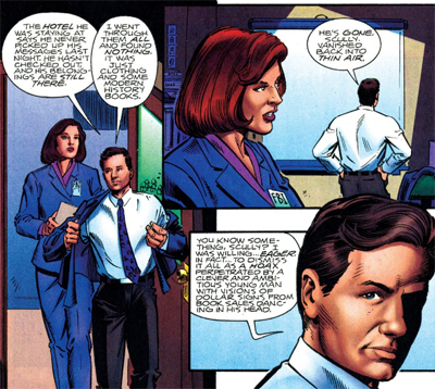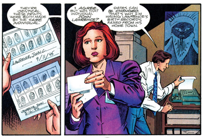 The story concludes with Scully explaining explicitly why this case matters so much to Mulder. “During his search for his sister, Mulder had been feeling the constant pressure of a ticking clock,” she remarks. “He was racing agaisnt time. If Lawrence had really been abducted and returned unaged after having been missing for 51 years, than why wouldn’t the same hold for Samantha who’s only been missing thirteen years? If she returned as a nine-year-old girl, she’d finally get to experience the childhood of which she was robbed.”
