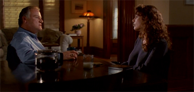 The scene is also a problem because it takes two fairly major characters in the world of the show – including the female lead! – and reduces their interaction to worrying about Frank Black. Sure, it makes sense for Catherine and Beltcher to be worried about Frank. Beltcher is his oldest friend, and Catherine is his wife. Frank is their common ground, so it makes sense for the two of them to talk about Frank. However, Gehenna suggests that this is all that Beltcher and Catherine do. There is no sense of who these characters are outside of Frank Black.