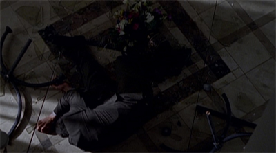 This killer, Frank informs us, is “teaching us a lesson about our pretensions to safety… about how vulnerable we are.” Similarly, it is Millennium teaching the audience that very lesson: an alarm system keypad does not guarantee safety when you drop your guard, when you don’t know who has been inside your home, when visitors or strangers enter and leave. Accordingly, by episode climax, an imperiled family is rescued by a more traditional style, old-fashioned “security system”: the family dog. The canine does away with the home invader, pitching him over a second story ledge and onto (and through…) a glass table in the foyer below.
