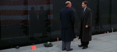Many of the writers on The X-Files came of age in the shadows of Watergate and Vietnam; those twin tragedies inform a lot of The X-Files, directly and indirectly. Howard Gordon, Glen Morgan and James Wong are all fond of including references to Vietnam in their scripts. In E.B.E., Deep Throat claimed to have killed an extraterrestrial who had crashed in Hanoi. In One Breath, Walter Skinner confirmed that he enlisted for Vietnam, and that the experience changed him. In Never Again, Scully contemplates her mortality in the shadow of the Vietnam War Memorial.