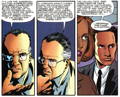 This was quite apparent during the first year or so of Topps’ tie-in comic book. The Cigarette-Smoking Man and Skinner made a couple of quick appearances, but elements of the larger mythology were largely absent. Mr. X only appeared once in the comic, as an informant in One Player Only. Because the show was not going to let the comic play with these story elements, and because of the time gap between writing a script and publishing a comic, the comic book simply could not play along with the mythology featured in the show.