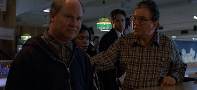 So the sequence where Mulder chases Harold into the mechanics of the bowling alley is also uncomfortable; it feels almost like pulling back the curtain in The Wizard of Oz. It reveals the mechanics that most people take for granted; behind the bright façade out front is a cold and automated process, gears and levers and dust. Elegy works best when contrasting the bubbly and bustling front of the bowling alley with the creepy space lurking just behind those pins and gutters.