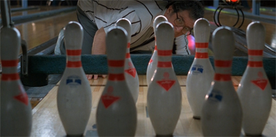 Amidst all the miscommunication and “%!#$ing language problem(s)”, a state of polytemporality in a society which, unlike San Carlos Apache, does not value temporal ambiguity, the phrase “let’s go bowling, Dude” stand as a balm even in the worst of times. The comfort of the bowling alley, surrounded by friends and a set of familiar rules, is held out as a reconciliation similar to that suggested in Field of Dreams between Ray and Terence Mann. The Sixties activist (co-author of the original Port Huron statement) and the Vietnam vet, an image for two of the many divergent historical trajectories and divergent masculinities that coexist in the present moment, are brought together in a game that involves much clearer line and simpler rules than baseball (though these lines too, can be crossed). Bowling, the simple framework of which involves setting them up and knocking them down, in a limited number of combinations, resembles a functionalist ritual, the repetition of which provides the comfort that promises a Durkheimian social glue on a society that would otherwise spin apart in too many divergent directions. Setting them up and knocking them down.