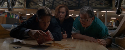 The idea of setting an episode of The X-Files in a bowling alley is inspired. It is no wonder that – according to I Want to Believe – this episode began as an index card labelled “Haunted Bowling Alley” on John Shiban’s bulletin board. There is something inherently fascinating about bowling alleys: the constant noise, the bright colours, the group activities, the friendly competitiveness, the structured order of the fun as it occurs. All of this is juxtaposed against the cold mechanics of the environment: the pins that sort themselves, the scoreboard, the ball returning to you.