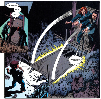Unfortunately, there is nothing in Surrounded that quite justifies the additional length. Indeed, the comic might even have been stronger had it been whittled down to a done-in-one monster story. The additional space doesn’t add any room for character or nuance, but it also does not add to the scale of the story. There are no splash pages as effective as those used in Remote Control, for example. Mulder and Scully feel very much like stock action heroes in this comic, rather than unique individuals.