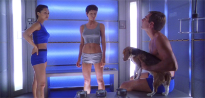 Greenberger is entirely correct here. The decontamination sequences are a disaster. Since they first appeared in Broken Bow, they cast a pretty significant shadow over the rest of Enterprise. Although the show would eventually accept it as a failed experiment – allowing crew members to move through it fully clothed – the show is still at the stage where it thinks all this is sexy.