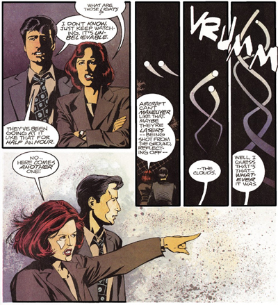 Although The X-Files was only at the end of its fourth season, it is interesting that it rejects this urge towards revision in its own archaeological investigations. These Season One comics avoid any real attempt to smooth continuity or to wink forward. Deep Throat contains very few nods towards the next four years of the show. The only real hint at what is to come is the way that Claude St. Aubin uses the more detailed glimpses of alien ships in Paper Clip and Apocrypha to help give a bit more detail to the “money shot” at the end of Deep Throat.